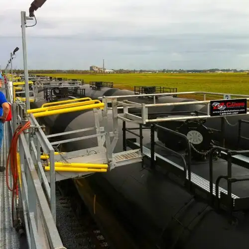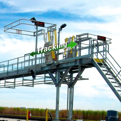 Our track-mounted gangways move horizontally along a steel track, allowing safe access to locations on top of your trucks and railcars. A tracking gangway is ideal when there is variation in lengths of vehicles and/or hatch openings that must be accessed. For even greater access, multiple gangways can be used on the same track to allow spotting at numerous rail cars at once.